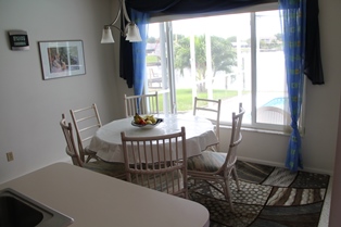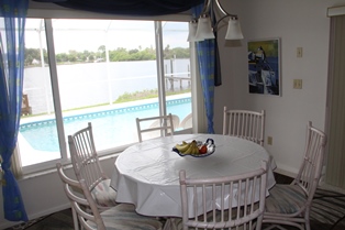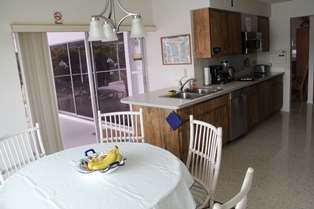 Küche und Essplatz mit Blick auf den Pool und das Meer